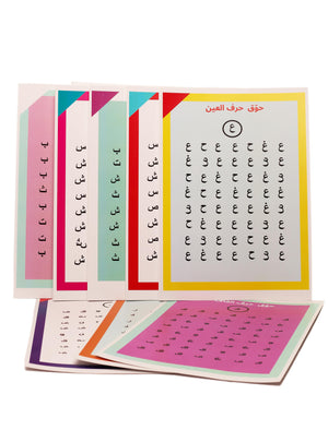 It includes 28 A4 thick sheets. Each sheet targets an Arabic letter. The sheets include the targeted letter to identify among other visually similar and reversed forms of the targeted letter.
